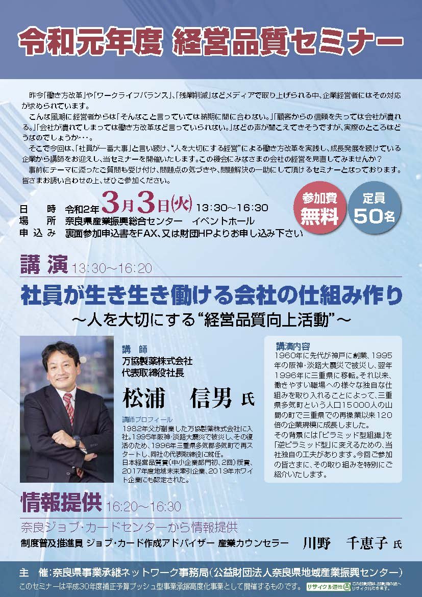 令和元年度 経営品質セミナー「社員が生き生き働ける会社の仕組み作り」~人を大切にする“経営品質向上活動”~