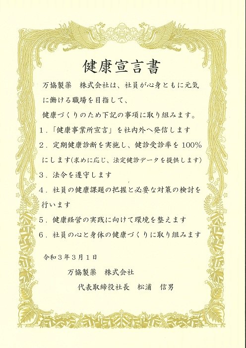 健康宣言書 2021.03.01 当社はこのたび、全国健康保険協会(協会けんぽ)の「健康宣言」に参加いたしました。 社員の皆さんが心身ともに健康で、安心して働ける職場づくりを目指し、会社として健康づくりに積極的に取り組んでまいります。