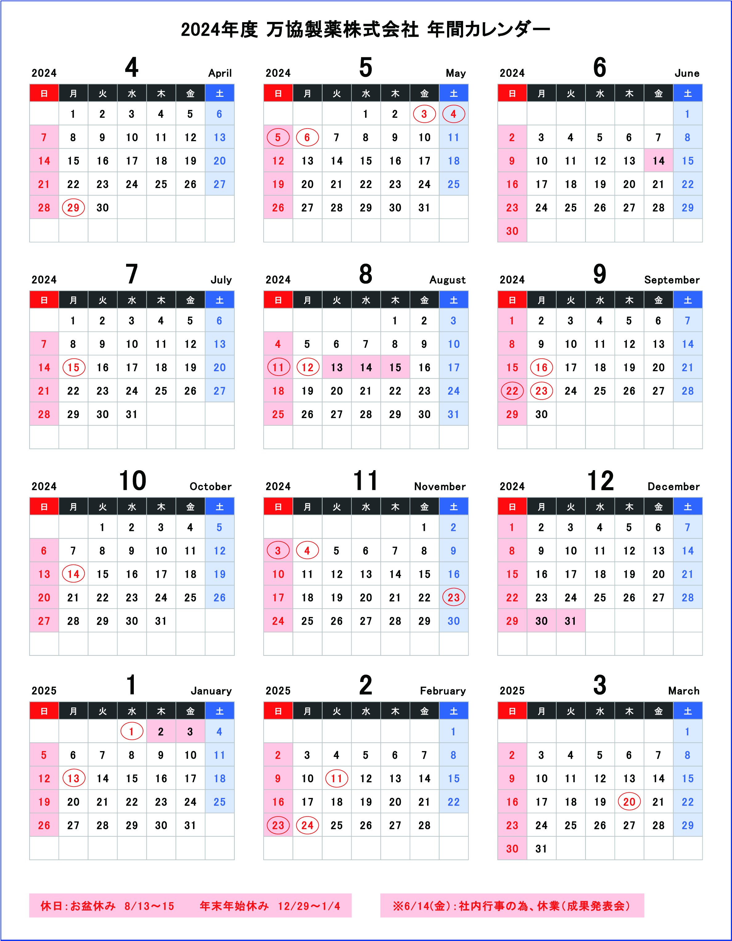 2025年度 万協製薬株式会社営業日カレンダー 2025.04.01 製造スケジュールに合わせて社内休業日を設定しております。 一部の祝日については営業し、その翌日もしくは前日を振替休業日とさせていただいている日がございます。 ご迷惑をおかけいたしますが、何卒ご了承の程よろしくお願い申し上げます。▼営業日カレンダー