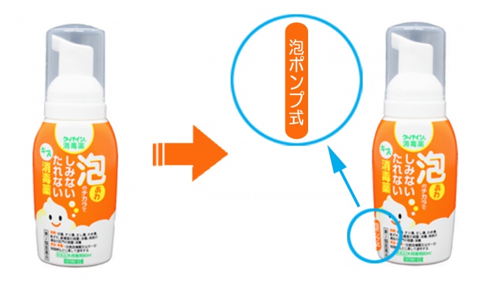 改 善 「ケーパイン消毒薬(泡タイプ)」は、プッシュ式のノズルタイプです。 容器上部のポンプを押していただくと、泡の消毒薬が出てきます。 ご使用いただく際にわかりやすいように、容器の表面に「泡ポンプ式」と表示しました。