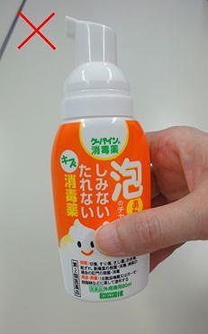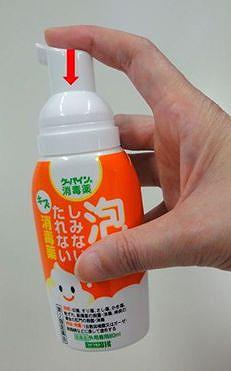←写真のように容器上部のポンプを押すと泡の消毒薬が出てきます。