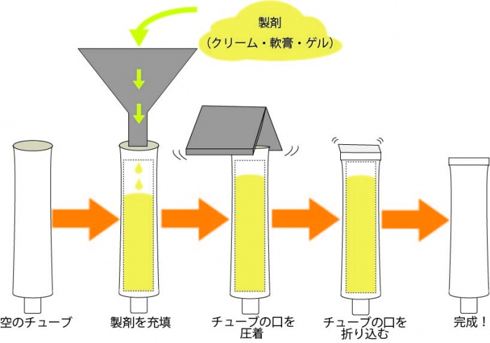 イラストの通り、チューブの”折”の部分から製剤(クリーム・軟膏・ゲル)を詰めています。詰めた後にチューブを折り込むためどうしても空気がチューブの中に入ってしまいます。