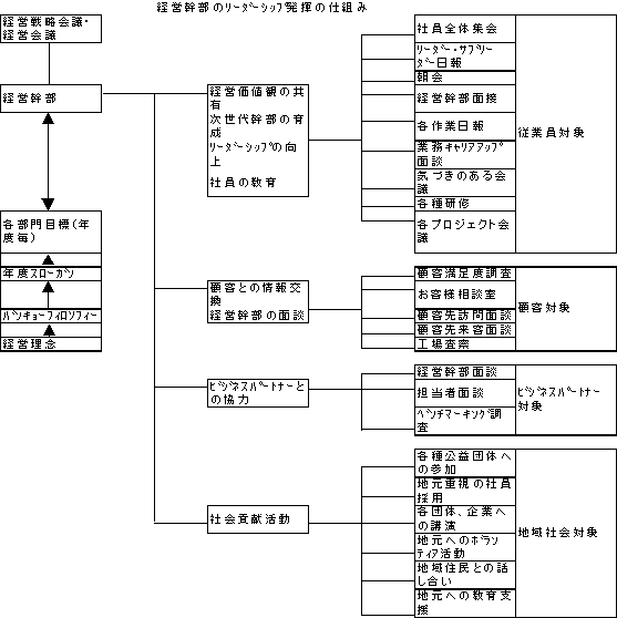 弊社の経営は三重県での再創業以来、社長が強いリーダーシップを発揮し指導してきました。しかし、経営品質向上活動が社内で根付き始めたのをきっかけとして、次第に課長職以上を中心とした組織的な集団リーダーシップが形成されるようになりました。弊社の大切にしている価値観は、経営理念に表れています。