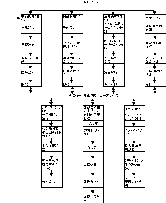 弊社では顧客に、弊社で製造した製品を提供することで直接価値を提供していますので、いわばこのことが弊社の基幹プロセスとなります。この基幹プロセスは、そのため大きく分けて
